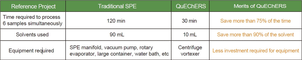 The QuEChERS method is a residue detection method for multiple target objects in the analysis of pesticide residues in the matrix with high water content (80-95%). It is the fast version of SPE with the similar cleaning effect, but its treatment steps are more concise. QuEChERS method has the characteristics of time saving, high efficiency and economical. There may be a large number of chlorophyll, lipid, steroid and other compounds in sample matrix of food, animal products and so on. These extracts can seriously interfere with the analysis of target substance, while QuEChERS method can effectively reduce these problems. With a few simple steps. it can complete the preparation of pesticide residues and other samples. Nowadays, this method has been widely accepted worldwide, if it is applied to your project, you will find that it can significantly reduce the time required for method development and pretreatment.