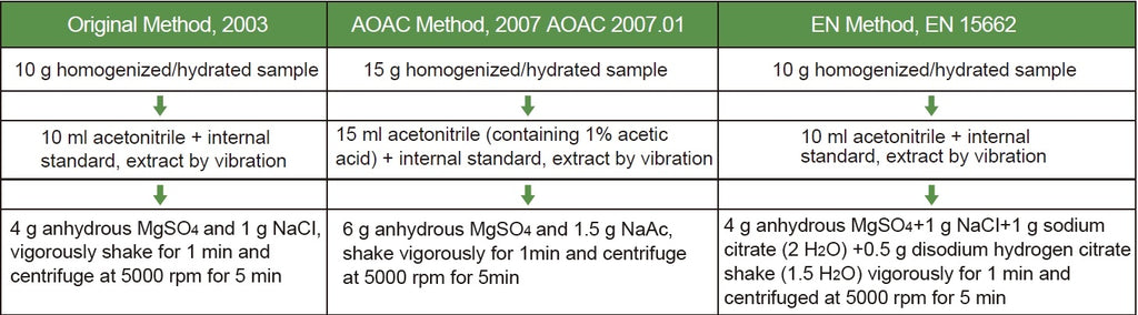- Adding acetic acid will affect the cleaning effect of PSA adsorbent and leading peak, tailing peak may occur in GC chromatogram. If this happens, a QuEChERS method without acetic acid can be used instead.